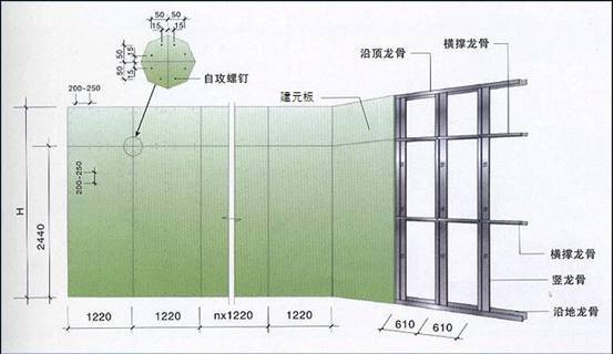· 通常情況下,作隔墻的建元板鋪設(shè)應(yīng)由下至上,采用縱向排布,即板的長(zhǎng)邊落在豎龍骨上。