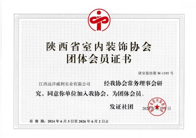 | Jiangxi Yuanyang Weili Industrial Co., Ltd. has joined the Shaanxi Provincial Interior Decoration Association and become a strategic centralized procurement cooperation unit of the association. |
