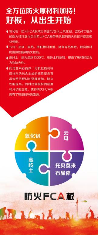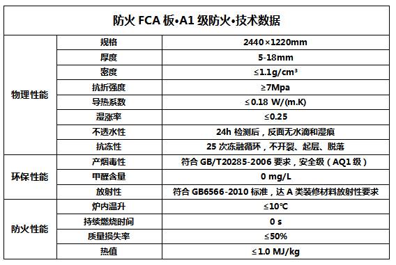防火FCA板產品性能介紹詳細 防火FCA板,真板不怕火煉 A1級防火板材·低密度更防火·綠色環(huán)保無甲醛 一、FCA板,很防火! 防火FCA板,是遠洋威利公司旗下側重于防火性能的板材系列。跟傳統(tǒng)的纖維水泥板和硅酸鈣板制品比,防火FCA板在原材料配比和生產工藝上略有不同,配方配比里添加氧化鋁、云母、高嶺土等有突出防火能力的原材料,工藝里側重強調降低板材密度、提高板材內部空間分子結構,從而達到降低導熱系數和提高防火性能目標。 防火FCA板,800℃不燃燒,1200℃無火苗,達到最高防火不燃級別A1級,若有火災發(fā)生時,板材燃燒持續(xù)燃燒時間為零,不產生有毒煙霧。導熱系數低使火焰溫度無法穿透板材,遇火燃燒的過程中能夠吸收大量的熱量,延遲周圍環(huán)境溫度的升高。 物理性能數據