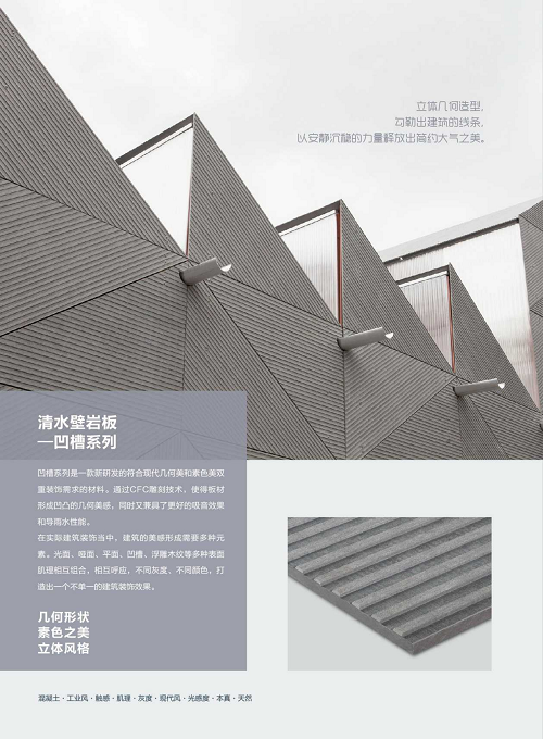 產(chǎn)品設(shè)計理念 遠(yuǎn)洋威利凹槽板系列是一款新研發(fā)的符合現(xiàn)代幾何美和素色美雙重裝飾的需求材料。通過CFC雕刻技術(shù),保留了原始水泥板的風(fēng) 貌,形成凹凸的幾何肌理。在實(shí)際建筑 裝飾中,建筑的美感形成需多種元素。光面、啞面、平面、凹槽、浮雕木紋等多種表面 肌理相互結(jié)合,相互呼應(yīng),不同灰度、不同顏色 打造出多樣性建筑裝飾效果。 產(chǎn)品性能