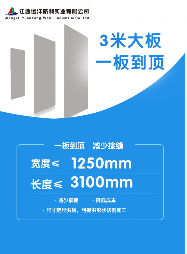 政策落地催生行業(yè)新需求 當(dāng)前市場上主流室內(nèi)裝飾板材長度多集中在2.4m至2.8m區(qū)間,住宅層高提升后,傳統(tǒng)板材需通過多段拼接完成墻面或柜體裝飾,易導(dǎo)致接縫明顯、材料浪費(fèi)、人工成本攀升等問題。業(yè)內(nèi)專家指出:“新規(guī)將倒逼建材企業(yè)加速技術(shù)迭代,超長一體化板材將成為未來剛需! 遠(yuǎn)洋威利3100mm超長板材破局行業(yè)痛點(diǎn) 作為在建筑材料深耕二十多年的企業(yè),遠(yuǎn)洋威利迅速響應(yīng)政策導(dǎo)向,依托持續(xù)的技術(shù)研發(fā)投入推出3100mm超長板材,精準(zhǔn)覆蓋3米層高需求。該產(chǎn)品以三大核心優(yōu)勢引發(fā)市場關(guān)注: 1. “零接縫”:單板高度可覆蓋全墻面,消除拼接痕跡,極大提升空間整體性與設(shè)計(jì)感; 2. “降本增效”:減少20%以上裁切損耗,施工效率提升25%,助力開發(fā)商、裝修公司優(yōu)化成本; 3. “品質(zhì)升級”:遠(yuǎn)洋威利生產(chǎn)的低密度灰硅基層板應(yīng)用于各領(lǐng)域,形成“回收—生產(chǎn)—應(yīng)用”閉環(huán),使建材附加值提升300%(防火、耐久、無甲醛、環(huán)保于一體),從低碳生產(chǎn)到全場景應(yīng)用,構(gòu)建“無廢城市”產(chǎn)業(yè)鏈閉環(huán)。